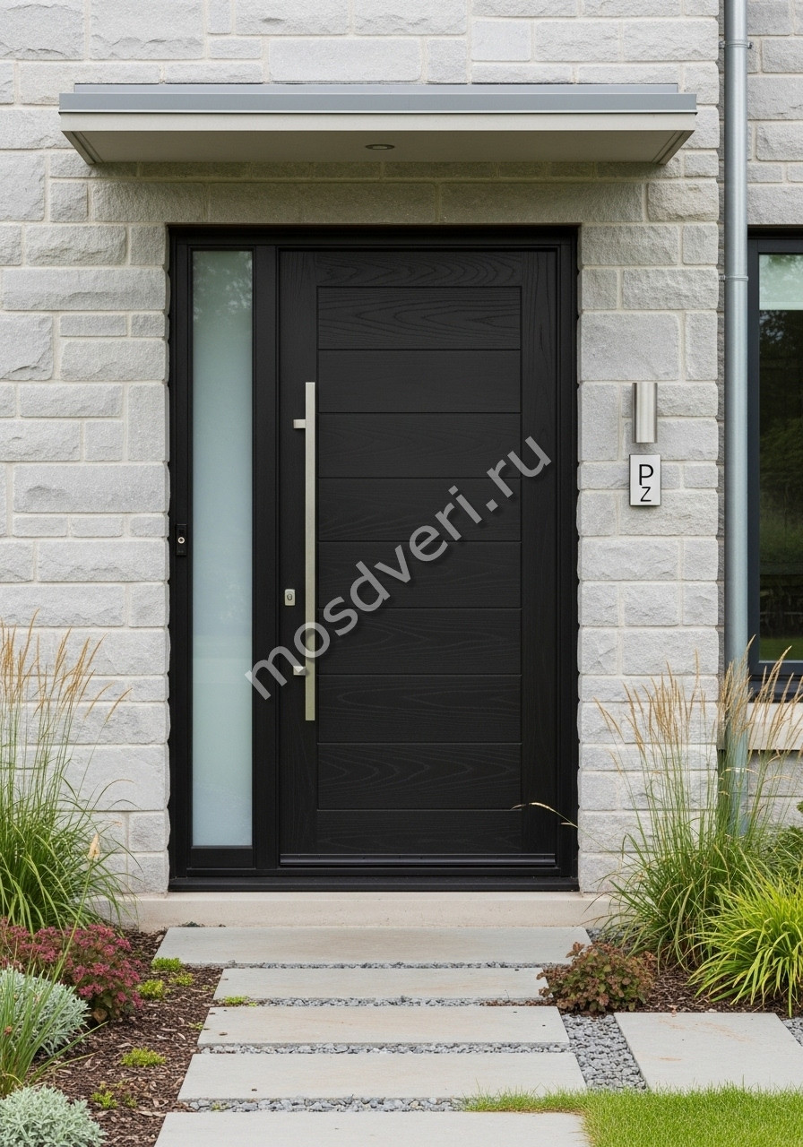 Высокая входная дверь в коттедж со стеклом — объединяет эстетичность и максимальную защиту.